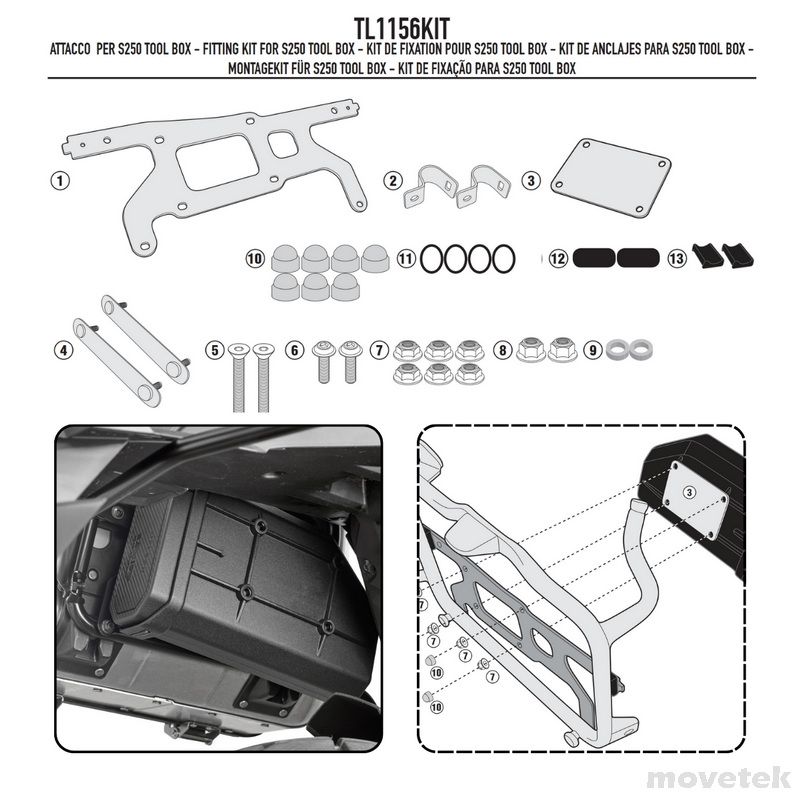 Bộ KIT gắn hộp đồ nghề Givi TL1156KIT dùng để gắn hộp đồ nghề Givi S250 lên một số dòng xe của BMW, Honda (xem danh sách đầy đủ ở dưới)
