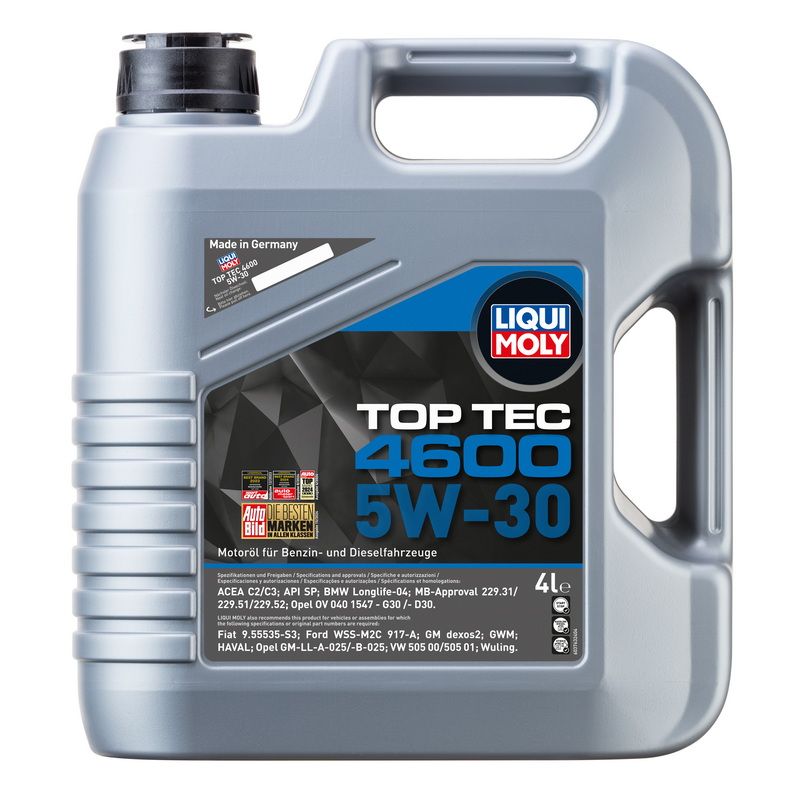 Liqui Moly 5w30 Top Tec 4600 là dầu động cơ ma sát thấp hiện đại hàng đầu dành cho động cơ xăng và diesel có hoặc không có bộ lọc hạt diesel (DPF) và turbo tăng áp. Sự kết hợp độc đáo bởi dầu gốc sử dụng công nghệ tổng hợp, cùng với công nghệ phụ gia mới nhất, đảm bảo dầu động cơ cung cấp sự bảo vệ, đặc biệt chống mài mòn và giảm mức tiêu thụ dầu và nhiên liệu, đồng thời đảm bảo rằng động cơ được cung cấp dầu ngay lập tức. Sản phẩm cho phép chu kỳ thay dầu lên tới 40.000 km, tùy thuộc vào thông số kỹ thuật của nhà sản xuất. Ngoài ra Liqui Moly 5w30 Top Tec 4600 còn phù hợp cho xe ô tô chở khách chạy bằng khí đốt CNG LPG